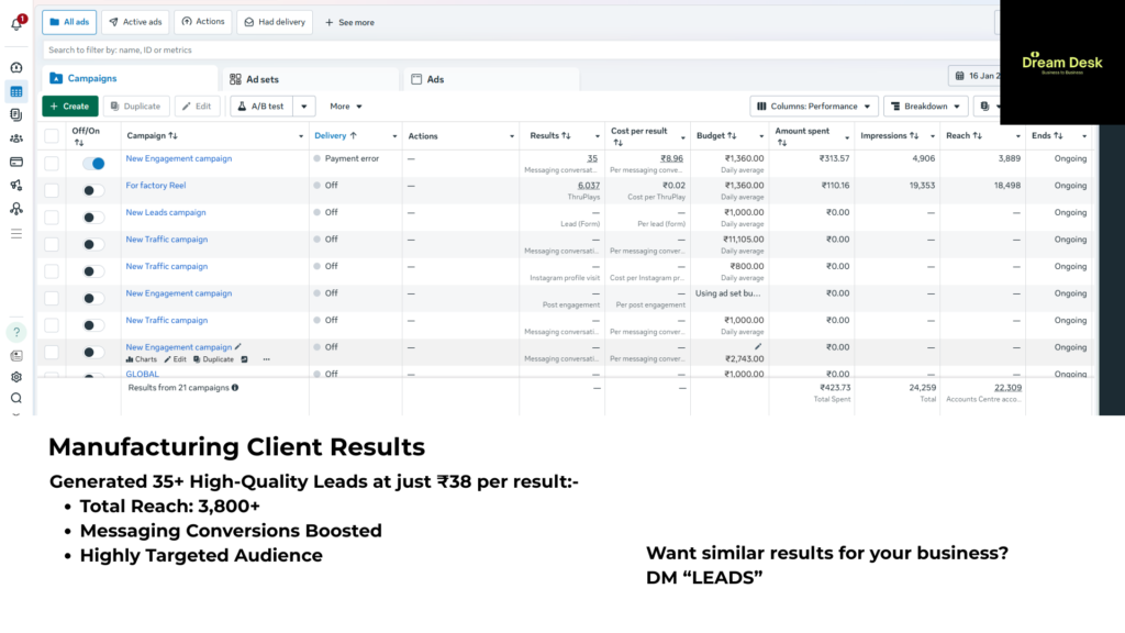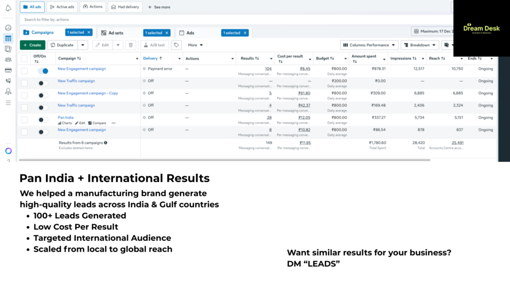 Dream Desk is a digital marketing agency that helps businesses generate high-quality leads through Facebook Ads, Google Ads, and high-converting websites. Our goal is to create powerful digital systems that attract customers and help your business grow faster online.